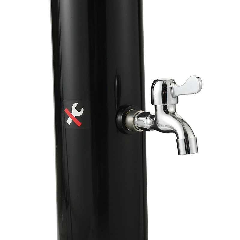 - The warm water in the tank mixes with the cold water from the garden hose via a single lever metal mixer tap. So the water temperature can be continuously adjusted as desired. The solid metal base ensures a secure and stable position.
